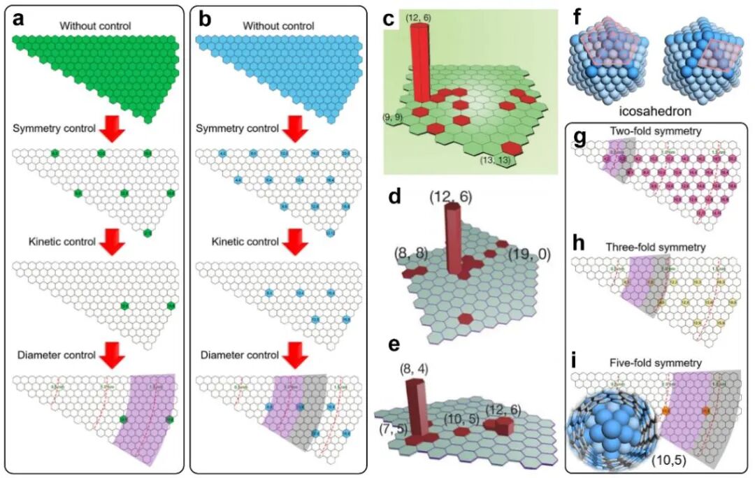 图 5 从具有(a)6重和(b)4重对称性的固体催化剂上选择性生长单壁碳纳米管的三步机制。(c)Co7W6固体催化剂上生长的单壁碳纳米管样品的手性分布图。由(d)Mo2C和(e)WC 固体催化剂生长的单壁碳纳米管样品的手性分布图。(f)二十面体粒子的原子模型。它的顶点具有5重对称表面,而它的棱具有2重对称表面。在具有(g)2、(h)3和(i)5重对称性的固体催化剂表面,选择性生长单壁碳纳米管的三步机制。
