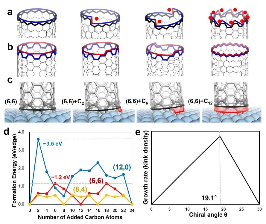 图 3 在螺旋位错理论下,(a)如果将ZZ管视为“完美”管,随着手性角的增加,管端会出现更多缺陷(kink)。(b)如果将AC管视为“完美”管,随着手性角的减小,管端会出现更多缺陷。(c)(6,6)单壁碳纳米管通过将碳原子添加到碳管-催化剂界面而在金属表面上生长的原子模型。(d)单壁碳纳米管(12,0)、(8,4) 和 (6,6)在生长过程中界面形成能的演变。(e) 单壁碳纳米管的生长速率与手性角的函数关系。