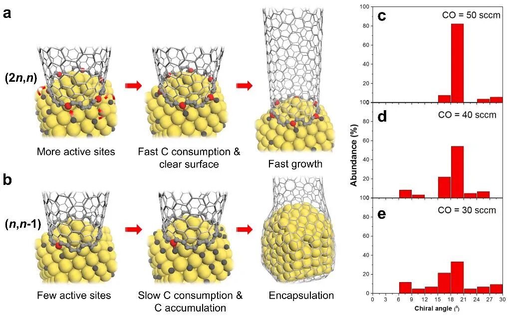 图 7 没有或有蚀刻剂条件下的SWCNT生长。(a)(2n,n)管具有足够的活性碳结合位点来消耗大部分碳源,因此可以保持继续生长。(b)近AC或近ZZ的SWCNT具有很少的活性位点,导致碳在催化剂表面积累并最终导致催化剂的毒化。(c-e)在不同CO流速下生长的SWCNT的手性分布。