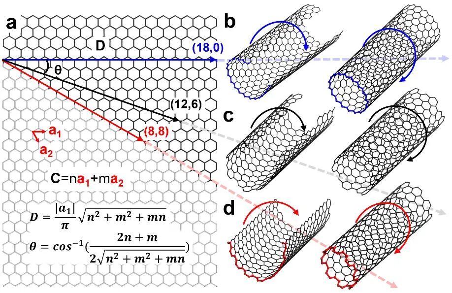 图 1 (a)单壁碳纳米管的手性,其中a1和a2是石墨烯的基本向量,C是单壁碳纳米管的手性向量,我们可以根据手性向量的方向和长度获得不同的单壁碳纳米管(b-d)。图中还标识了单壁碳纳米管的手性角θ和直径D与手性指数(n,m)的函数关系。
