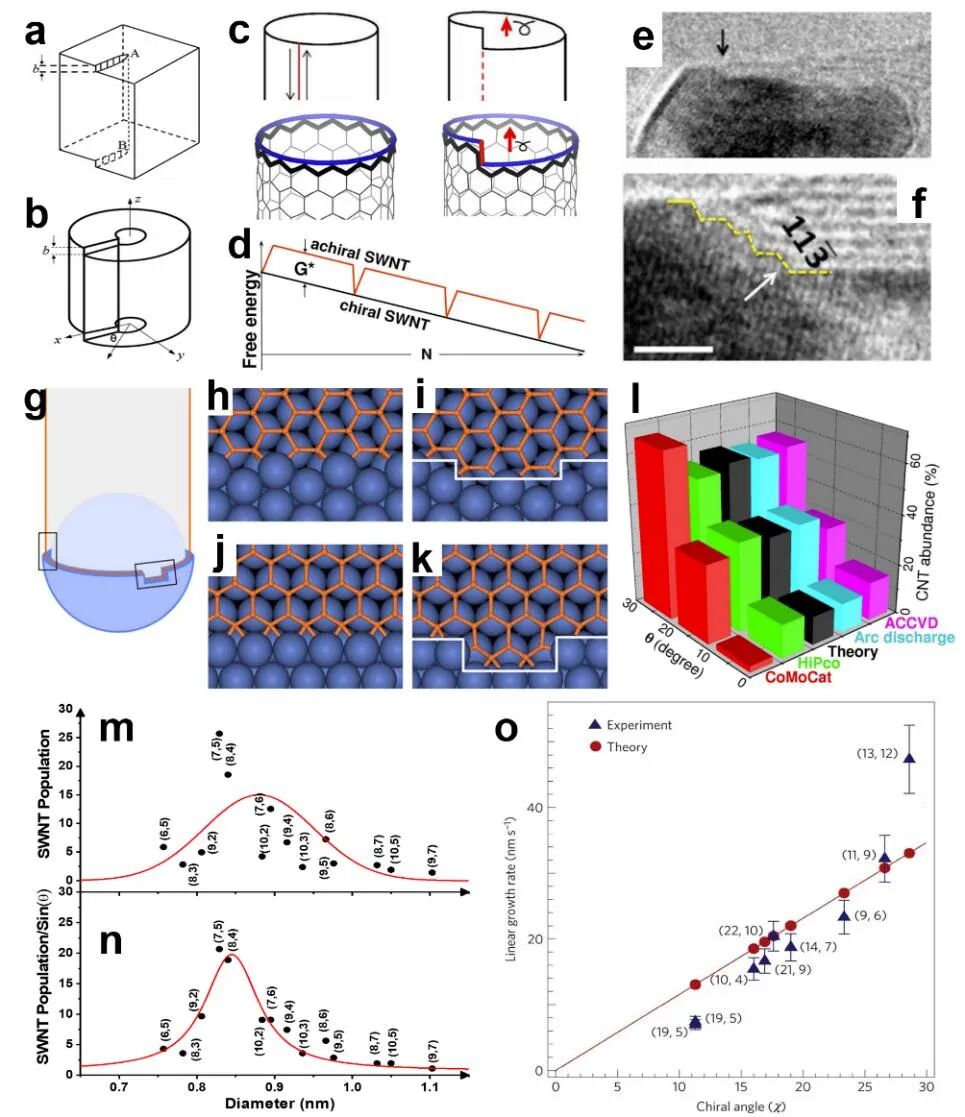 图 2 (a)立方晶体和(b)圆柱环中的螺旋位错示意图。(c)在ZZ管中引入螺旋位错将其变成手性管。(d)手性和非手性单壁碳纳米管生长过程中的自由能演变图。(e-f)碳纳米管成核和生长过程中观察到的催化剂界面阶梯状形态的高分辨率TEM图。(g)连接在Ni(111)表面的金属台阶上的AC(h-i)或ZZ(j-k)单壁碳纳米管边缘上产生下一个六元环的成核过程。(l)与理论预测相比,通过各种实验合成方法的单壁碳纳米管样品的手性角分布。(m)实验测量的单壁碳纳米管的数量分布与直径的关系,以及(n)使用来自参考文献的数据重新调整的单壁碳纳米管的数量分布与直径的关系。(o)单壁碳纳米管手性角依赖性生长速率的原位观察。