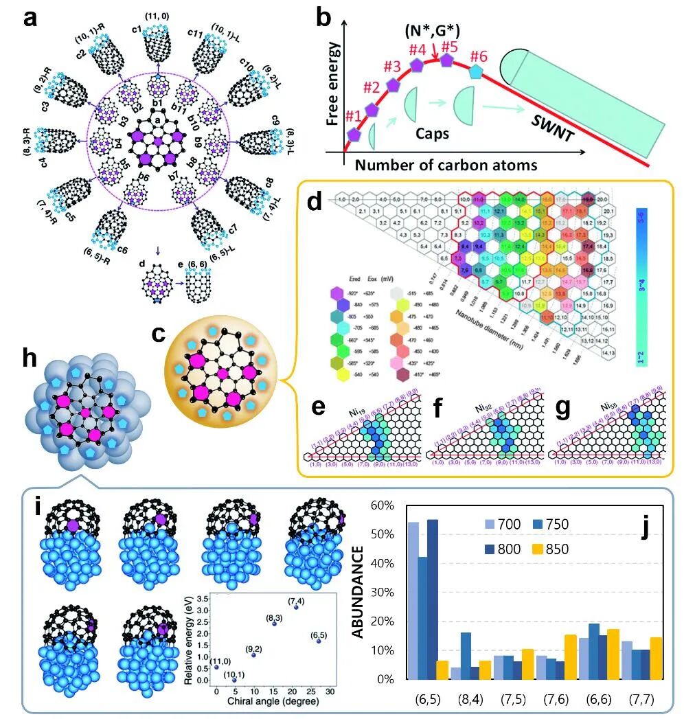 图 4 (a)单壁碳纳米管从具有五个五边形的碳帽成核的过程中的手性分配。从中我们可以看到最后一个(第6个)五边形的形成可以将最终的单壁碳纳米管调整为任意手性。(b)单壁碳纳米管成核和生长过程中的自由能演变。(c)液体催化剂表面上的有五个五边形的碳帽。其中所有可能产生第6个五边形的位置都具有相同的环境。(d)HiPco方法得到的单壁碳纳米管样品的手性分布图。(e-g)分别由液态Ni19、Ni32 和 Ni55颗粒模拟催化生长得到的单壁碳纳米管的手性图。(h)固体催化剂表面上的有五个五边形的碳帽,其中所有可能产生第6个五边形的位置都具有不同的环境。(i)Ni55固体催化剂上各种手性的单壁碳纳米管的碳帽的相对界面形成能。(j)不同温度下生长的CoMoCat单壁碳纳米管的手性分布。