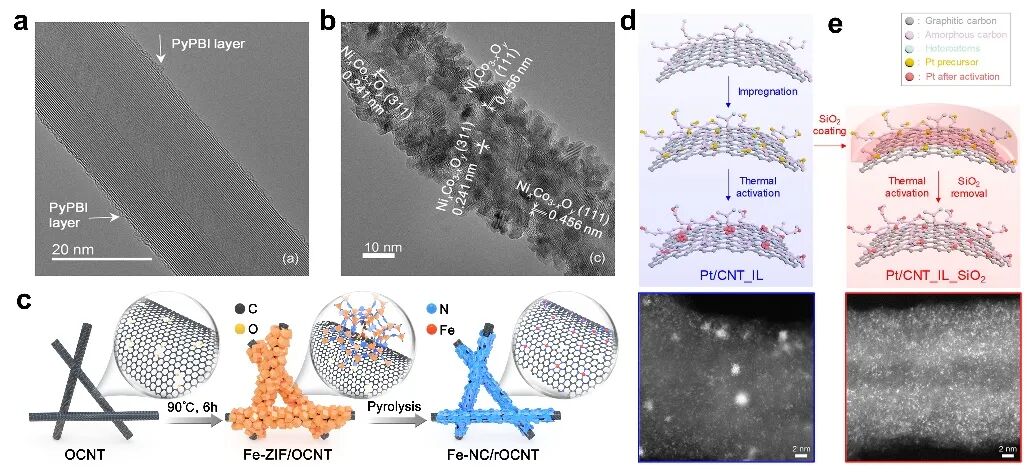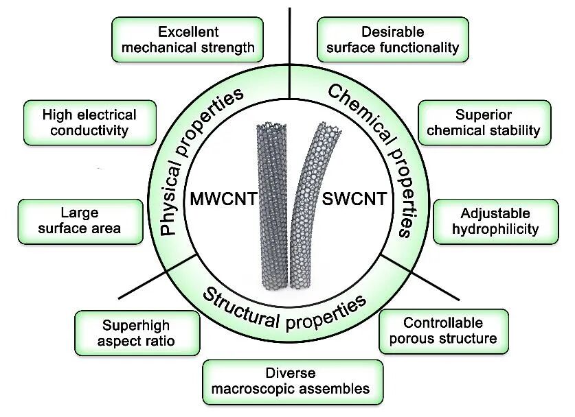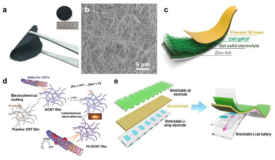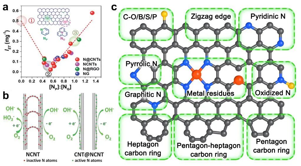 氧电催化反应是燃料电池和金属-空气电池运行的关键过程。碳纳米材料因其比表面积大、结构多样而被广泛应用于氧电催化反应的催化剂。适合氧电催化反应的碳材料应具有以下性质:大的暴露比表面积、优异的导电性、适当的亲水性和高的化学稳定性。碳纳米管(CNTs)完全满足这些要求,使其成为催化剂的理想候选材料。经过多年的发展,CNTs已被广泛应用于无金属催化剂和金属催化剂载体。