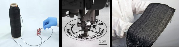 连续化生产的导电蚕丝纱线(左),机械绣花(中)和织物(右)