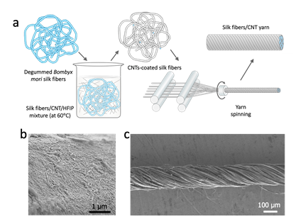 基于这一需求以及之前的研究基础(Nat. Commun.2017, 8,1387),凌盛杰教授课题组设计了一种碳纳米管混合浆料,利用简单的浸泡-纺纱技术即可制备高性能导电蚕丝。相比其他基于蚕丝的功能化纤维的制备方法,如湿法、干法纺丝、碳化蚕丝等,这个新的策略几乎完全保持了天然蚕丝本身的结构及力学性能,并且可以稳定负载较大含量的导电纳米材料。