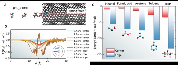 定向分子动力学模拟发现(a,b)溶剂分子更倾向于进入碳纳米管内部。(c)不同溶剂分子在碳纳米管内移动的势垒对比。