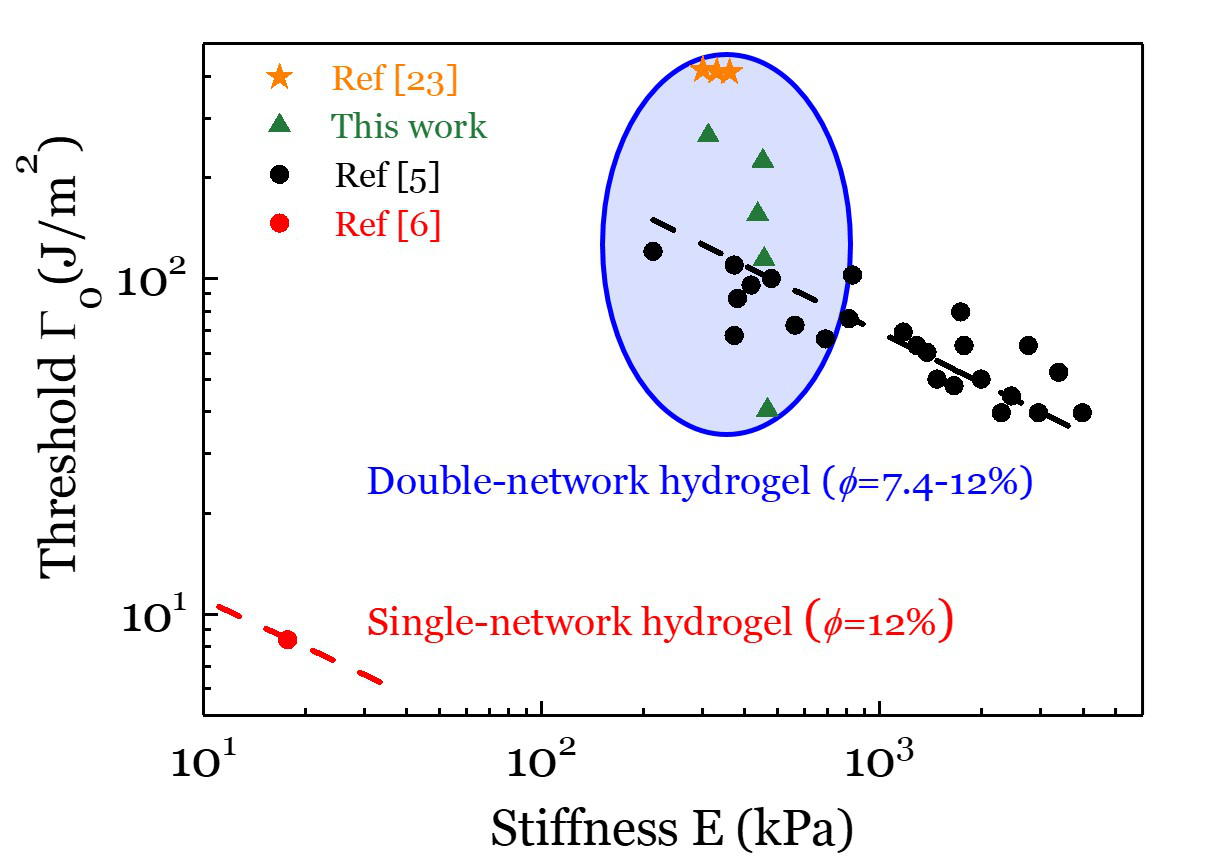 在设计特定的应用结构时,需要不同的材料性能组合,如刚度、强度、断裂应变、断裂韧性和疲劳门槛值。双网络水凝胶高的断裂韧性一直以来受到人们的重视。该研究探索得出双网络水凝胶具有另一个重要特性:可有效解决刚度-门槛值矛盾,这可以作为设计高刚度和高疲劳门槛值水凝胶和弹性体的一般原则。