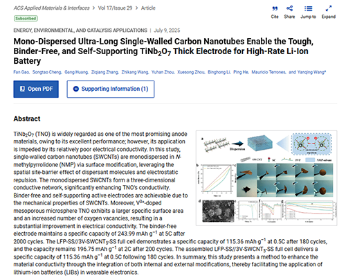 基于此,四川大学王延青特聘研究员课题组,在国际知名期刊ACS Applied Materials & Interfaces上发表题为“Mono-dispersed ultra-long single-walled carbon nanotubes enable the tough, binder-Free, and self-supporting TiNb2O7 thick electrode for high-rate Li-ion battery”的研究论文。文章第一作者为四川大学高分子科学与工程学院硕士研究生高凡,文章通讯作者为四川大学特聘研究员王延青。