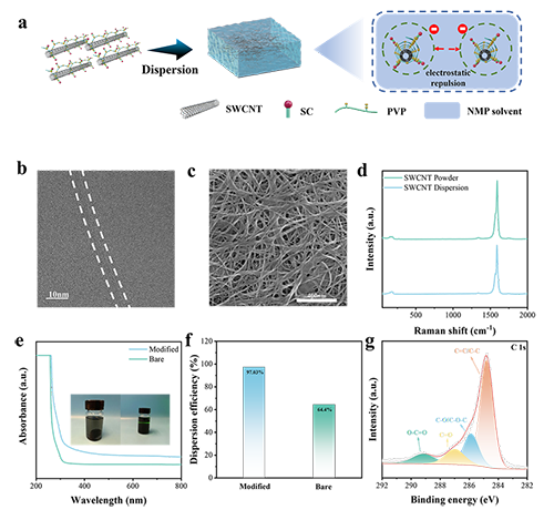 图1: a)SWCNTs 分散机制及电极制备过程示意图;b-c)单分散 SWCNTs 与分散剂结合的透射电子显微镜(TEM)和扫描电子显微镜(SEM)图像;d)SWCNT 粉末及其分散液的拉曼光谱分析;e)紫外 - 可见(UV-vis)光谱数据;f)SWCNT 溶液的分散效率及分散效果;g)SWCNT 的高分辨 X 射线光电子能谱(XPS)C 1s 谱图。