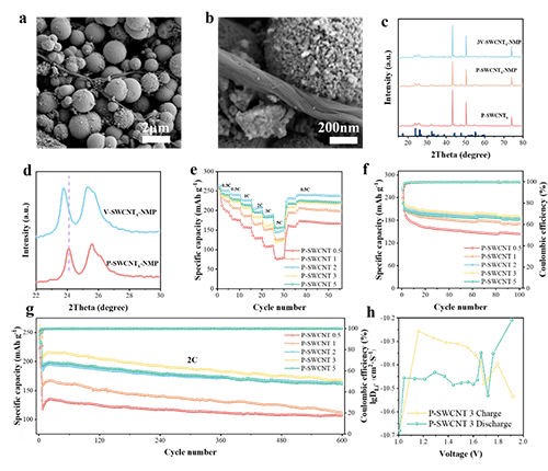 图2: a-b)P-SWCNT3 电极的 SEM 图像;c-d)各电极的 X 射线衍射(XRD)图谱;e)P-SWCNTx 电极的倍率性能;f)P-SWCNTx 电极在 0.1C 倍率下的循环性能;g)P-SWCNTx 电极在 2C 倍率下的循环性能;h)P-SWCNT3 电极的恒电流间歇滴定(GITT)曲线。
