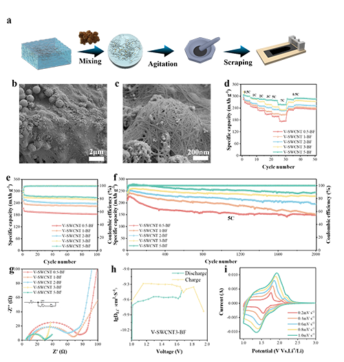 电池性能受活性材料本征特性与电极结构的共同影响。传统电极制备中,需使用聚偏氟乙烯(PVDF)粘结剂将活性材料、导电剂与集流体粘结,但电化学惰性的 PVDF 不仅会阻碍电子迁移(降低电导率),还会增加电极质量(降低能量密度),因此无粘结剂电极的研究备受关注。本研究利用 SWCNTs 优异的力学性能与高效网络结构,制备了无粘结剂电极(命名为 V-SWCNTx-BF)(图 3a)。V-SWCNTx-BF 电极省去电化学惰性粘结剂,显著提升电子与电荷传输效率。