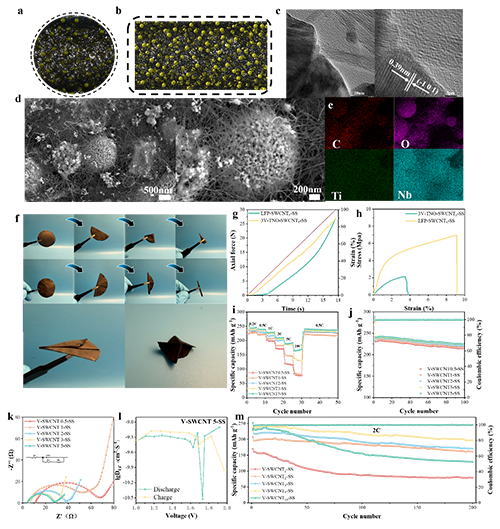 图 4b-c 显示,SWCNTs 保持稳定单分散,无明显团聚现象,且相互连接形成三维导电网络,V-TNO 介孔微球通过物理缠绕嵌入网络中,进一步提升电导率。SWCNTs 的优异力学性能为三维导电网络提供了足够的机械强度,确保无粘结剂状态下电极结构稳定。