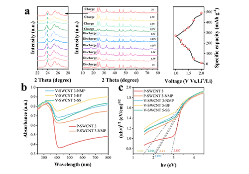 图 6a 与图 S18 分别为 V-SWCNT5-SS 与 V-SWCNT5-BF 电极的原位 XRD 结果:无粘结剂自支撑电极的储锂过程为 Li?在 TNO 晶格间隙与空位中的放电嵌入 / 充电脱嵌;V-SWCNT5-SS 电极的 (-1,0,1) 衍射峰在充放电后恢复至初始位置,表明三维导电网络提升了循环稳定性。通过紫外 - 可见吸收光谱计算各电极的禁带宽度(图 6b-c):与 P-SWCNT3 电极相比,采用 SWCNT 分散液构建导电网络的电极禁带宽度显著降低。对比 V-SWCNT5-BF、V-SWCNT--NMP 与 P-SWCNT3-NMP 电极可知:1. V3?掺杂在费米能级处引入杂质能级,缩小了价带与导带间的能隙;2. 氧空位的引入增加了孤电子数量;3. 无粘结剂设计提升了电荷与离子传输速率。最终,无金属集流体的自支撑电极通过三维蛛网式导电网络进一步提升了 TNO 的电导率,使禁带宽度大幅降低。