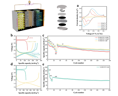 图 7 a)LFP-SS//3V-SWCNT5-SS 全电池在不同扫描速率下的 CV 曲线;b)LFP-SS、P-SWCNT3-NMP、3V-SWCNT3-NMP、3V-SWCNT5-BF、3V-SWCNT5-SS 电极的恒流充放电曲线;c)LFP-SS//P-SWCNT3-NMP、LFP-SS//3V-SWCNT3-NMP、LFP-SS//3V-SWCNT5-BF 全电池的倍率与循环性能;d)3V-SWCNT5-SS 电极的恒流充放电曲线;e)LFP-SS//3V-SWCNT5-SS 全电池的倍率与循环性能