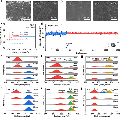 图4. 电解质中Na+沉积行为。在不同沉积时间下电极表面形貌(a)GDE、(b)CGDE的SEM图像。(c)在2mA/cm2下不同电解液的成核过电位曲线。(d)在2mA/cm2和2mAh/cm2下Na||Al电池的库仑效率。GDE中循环电极的(e)F 1s、(f)O 1s和(g)C 1s图谱。CGDE中循环电极的(h)F 1s、(i)O 1s和(j)C 1s图谱。XPS图谱显示在列上,每个高度对应于深度剖析结果。