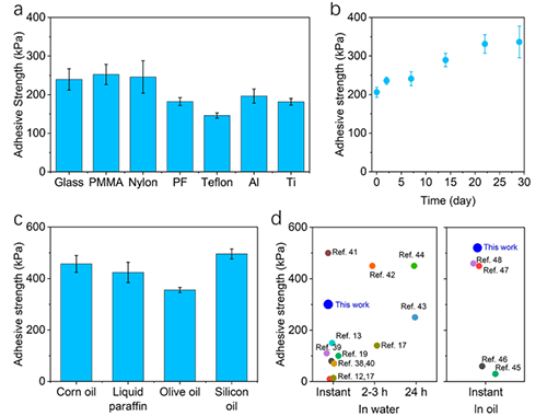 性能测试显示,Pcπ?PA凝胶薄膜在水下玻璃基底上的黏附强度可达约300 kPa,并且对塑料、金属等多种材料均表现出良好兼容性。更为突出的是,在油性环境中(如玉米油、硅油等),该材料的黏附强度最高可达500 kPa,优于目前报道的大多数同类体系。此外,这种胶膜还具有良好的可加工性,可制成胶带、贴片等实用形态,展现出向临床和工程应用转化的巨大潜力。