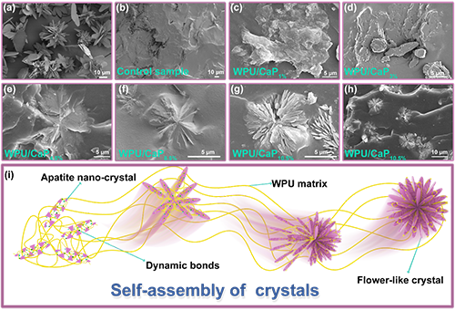 图1. 矿物与弹性体的SEM图:(a)矿物含量为4.5%的SEM图(该矿物样品是通过与WPU/CaP4.5%相同浓度的Ca2?、HPO?2?和H?PO??在水溶液中矿化获得);(b)直接将矿物掺入WPU/TA水溶液中制备的对照组样品的SEM图;(c-f)分别为WPU/CaP1%、WPU/CaP3%、WPU/CaP4.5%及WPU/CaP8.5%弹性体的SEM图;(g-h)不同放大倍数下WPU/CaP10.5%弹性体的SEM图;(i)WPU基体中磷灰石纳米晶体组装形成花状矿物的过程示意图