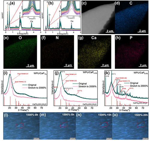 图2. WPU/CaP4.5%的EDS能谱分析:(a)脆断截面;(b)拉伸断裂截面;(c)WPU/CaP4.5%的TEM图;(d-h)对应的C、O、N、Ca和P元素分布图;(i-k)WPU/CaP1%、WPU/CaP4.5%和WPU/CaP8.5%在经历2000%应变拉伸前后的XRD曲线;(l-o)WPU/CaP4.5%样品在1500%拉伸应变下随时间变化的偏光显微镜图,其中红色方框标记区域为花状矿物晶体。