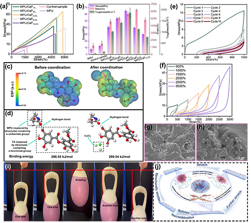 图3. (a)弹性体样品的应力-应变曲线;(b)对应的拉伸强度、拉伸应变及拉伸韧性;(c)单宁酸部分结构在配位作用前后的静电势分布;(d)单宁酸分子(部分结构)配位前后和WPU的氢键结合能变化;(e-f)WPU/CaP4.5%样品在不同条件下的循环加卸载拉伸曲线:(e)固定应变1000%条件下,(f)应变递增条件下;(g-h)WPU/CaP4.5%样品拉伸断裂截面的SEM图;(i)WPU/CaP4.5%样品举起自重约32000倍重物实物的照片;(j)拉伸过程中微观结构演化及增强增韧机制示意图。
