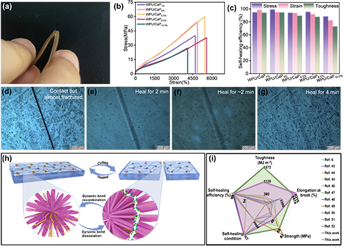图4.(a)WPU/CaP4.5%试样即将断裂但仍保持连接的实物图;(b)愈合后试样的应力-应变曲线;(c)应力、应变及拉伸韧性的自愈合效率;(d-g)不同愈合时间下WPU/CaP4.5%试样愈合过程的偏光显微镜图;(h)自愈合机制示意图;(i)本研究的弹性体样品与文献报道的其他材料在力学性能及自愈合能力方面的综合对比。