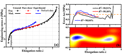 图3.应变不变量与官能度f的依赖关系。(a)Ogden型应变能密度与f之间的依赖性。(b)第二应变不变量I2与f之间的依赖性。