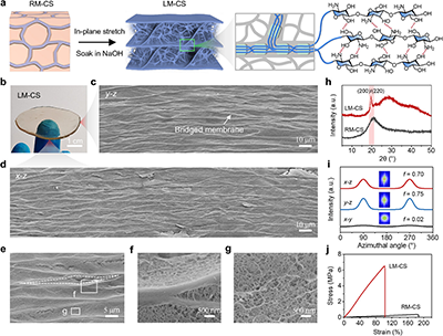湖南大学材料科学与工程学院王建锋教授课题组针对现有水凝胶难以在保持超高水含量(>90 wt.%)同时实现优异力学坚固性的难题,通过向具有超富水且坚固特色的水母学习,深层解析了钵水母纲根口水母目下沙海蛰中胶层的网络结构及其力学增强机制,发现水母中胶层具有长程有序的叠层膜网络结构,其以结晶有序的纳米膜作为网络单元,膜内晶体沿膜平面取向且胶原蛋白链跨膜连接,这种独特网络赋予水母中胶层超高含水量下优异力学性能;受水母中胶层的启发,进而发展两步法构筑具有叠层膜网络结构的壳聚糖水凝胶,包括1)通过缓慢蒸发诱导的相分离,预先形成无规膜网络,2)结合面内拉伸和氢氧化钠处理,转变无规膜网络为叠层膜网络;这种长程有序的叠层膜网络结构赋予壳聚糖水凝胶具有高模量(5.2 MPa)、高强度(6.5 MPa)、超高含水量(91.8 wt.%),性能优于现有大部分的合成水凝胶以及多种天然生物水凝胶。这项工作不仅提出了新的结构设计理念,也为制备超高水含量且坚固的水凝胶提供了可行的路径,同时突破了现有水凝胶材料在超高水含量和优异力学性能间的权衡难题。