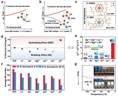 研究团队首先利用NMR谱深入探究不同阳离子对水分子氢键结构的调控机制。NMR作为一种强有力的分子相互作用表征手段,可直接探测参与氢键(HB)的氧(O)与氢(H)原子电子密度变化。结果显示,常见的 Li+、Na+、Mg2+、Zn2+和Ca2+仅表现出对氢核的屏蔽效应,而三价铝离子(Al3+)则呈现独特的去屏蔽效应,可同时作用于水分子的氧与氢原子,显著削弱氢键网络并重构水分子排列。密度泛函理论与分子动力学模拟进一步证实,Al3+对水分子间氢键有更强的扰动作用,导致水分子间氢键数量在低温下降时变化最小,从而有效抑制冰晶形成。最终,基于Al3+的电解液在仅2.8 m低浓度下即可实现 –117 oC 的超低冰点,验证了阳离子去屏蔽效应在构筑抗冻水系电解液中的关键作用。
