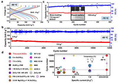 东华大学焦玉聪研究员长期致力于水系电解液与界面结构设计,围绕低温可逆电化学体系进行了系统研究,并取得了一系列重要进展(Small 2021, 17, 2103195; Adv. Mater. 2022, 34, 2110140; Angew. Chem. Int. Ed. 2023, 62, e202215060; Angew. Chem. Int. Ed. 2023, 62, e202314456; Energy Environ. Sci. 2023, 16, 4561–4571; Angew. Chem. Int. Ed. 2025, 64, e202423326)。但前期研究局限于中低温领域,最低至–40 oC。