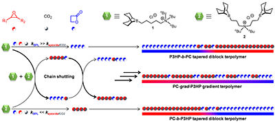 基于前期研究积累,浙江大学伍广朋教授课题组开发了一项精准聚合技术。该团队利用其自主研发的单核有机硼催化剂1与双核有机硼催化剂2之间的分子间链穿梭机制,成功将聚3-羟基丙酸结构单元嵌入到二氧化碳基聚碳酸环己撑酯PCHC和聚碳酸亚丙酯PPC高分子链中,制备出了序列可控的聚碳酸酯-聚羟基脂肪酸三元共聚物(图3)。该技术显著提升了聚碳酸环己撑酯PCHC的柔韧性和聚碳酸亚丙酯PPC的热稳定性和机械性能。相关研究成果发表于Angew. Chem. Int. Ed. 2025, e202517263.,博士研究生颜蕊为论文的第一作者,伍广朋教授为通讯作者。