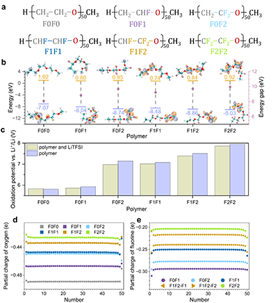 图1. 氟化 PEO 基电解质的电子结构与化学稳定性。(a) PEO(F0F0)及其氟化衍生物(F0F1、F0F2、F1F1、F1F2、F2F2)的化学结构。(b) 聚合物三聚体的最高占据分子轨道(HOMO)与最低未占据分子轨道(LUMO)的能级及轨道分布。随着氟化程度提高,HOMO 能级降低、HOMO–LUMO 能隙增大,表明氟化促进主链电子离域,从而提升化学稳定性。(c) 含盐与不含盐条件下的氟化 PEO 三聚体的理论氧化电位(相对于 Li/Li+)。(d, e) 聚合物中氧原子与氟原子的局部电荷分布。结果显示,随着氟化程度增加,聚合物氧原子的局部电负性降低,而电子在主链上的分布更加均匀。图中数字表示氟化单体从左到右的顺序,F1F2-F1 表示单氟环境下的氟,F1F2-F2 表示双氟环境下的氟。