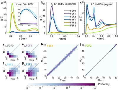 图3. Li+ 溶剂化结构与离子聚集行为。(a–c) Li+ 与不同组分的径向分布函数g(r):(a) Li+–TFSI? 氧;(b) Li+–聚合物氧;(c) Li+–聚合物氟。结果显示,氟化增强了 Li+–阴离子作用、削弱了 Li+–聚合物氧作用。(d–i) 不同体系下离子团簇尺寸分布:(d) F0F0、(e) F0F1、(f) F0F2、(g) F1F1、(h) F1F2、(i) F2F2。高氟化体系形成更大的离子簇,尤其是 F2F2 中,自由离子浓度显著降低。整体结果揭示了氟化诱导的两种不同溶剂化机制,并强调了平衡离子解离与聚集的重要性。