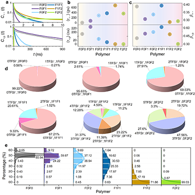 图4. 氟化聚合物电解质中Li+ 第一配位壳层的动力学与结构。(a) Li+–TFSI?(C+-(t))与 Li?–聚合物段(C+p(t))的停留时间自相关函数。(b) 由Kohlrausch–Williams–Watts(KWW)函数拟合C(t)得到的平均弛豫时间(<τ+->、<τ+p>);(c) 对应的拉伸指数(β+-、β+p)。结果表明,氟化普遍延长了 Li+–阴离子的配位寿命,同时改变了Li+–聚合物配位环境的均一性。(d) 各体系中Li+ 第一配位壳层的结构组成,显示随着氟化增强,聚合物氧的比例下降而阴离子配位比例上升。(e) Li+ 与聚合物氧的典型配位模式示意图,揭示了氟化程度与模式对 Li+–聚合物相互作用的调控规律。
