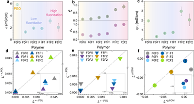 图2. 氟化聚合物电解质的离子传输性质。(a) 随氟化程度增加,离子电导率(σ)整体下降。图中不同颜色阴影代表三个氟化区间:非氟化(黄色)、低氟化(蓝色)和高氟化(红色)。(b) 随氟化增强,锂离子迁移数(t0+)和锂离子电流分数(ρ+)逐渐升高,表明氟化削弱了聚合物–Li+ 配位,提高了锂离子选择性传输能力。(c) 电解质综合能效(σρ+)表征导电性与电流分数的乘积。结果显示,F1F2 体系在导电性与Li+ 传输性质之间实现最优平衡。(d–f) Onsager 传递系数揭示了不同氟化区间不同物种运动相关性的差异::(d) L+-,POL与L++,POL 的对比;(e) L+-,POL与L--,POL的对比;(f) 离子–聚合物的Onsager 传递系数( L+p,COM与L-p,COM)。