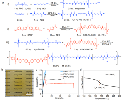 图1. PA-PU的合成、力学性能及热稳定性。(a) PA-PU的合成路线。(b) PA-PU的实物照片 (8 cm × 8 cm × 0.18 mm)。(c) PA-PU在不同温度下的应力-应变曲线。(d) PA-PU的DSC测试曲线。