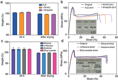 图3. PA-PU的化学稳定性。(a) PA-PU塑料在水、1 M HCl和1 M NaOH水溶液中浸泡24 h和干燥后的质量变化。(b) PA-PU塑料在不同水溶液中浸泡24 h后,未经干燥状态下的应力-应变曲线。(c) PA-PU塑料在乙醇、丙酮、正己烷和乙酸乙酯中浸泡24 h后经过干燥后的质量变化。(d) PA-PU塑料在各种有机溶剂中浸泡24 h,经60 °C干燥后的应力-应变曲线。