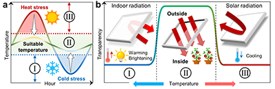 该纳米胶体基智能窗在透明态下展现出优异的光学性能,光合有效辐射(PAR)透过率高达91.18%,可见光透过率达92.31%;在温度过高时形成微米级聚集体降低透过率,太阳光调控能力(ΔTsol)最高达65.43%;在温度过低时同样提高漫反射效果,PAR漫反射率可达27.92%,显著提升补光效率。研究进一步通过农业模拟实验证实(图3),该智能窗可使番茄幼苗在热胁迫下的光合速率提升222.19%,绿萝在冷胁迫下的光合速率提高126.07%,同时分别降低制冷与供暖能耗11.61 kJ·m?3和2.96 kJ·m?3。该工作突破了传统温敏变色材料仅能单向响应的局限,为设施农业的光-热协同管理提供了无需外部能源的智能解决方案。