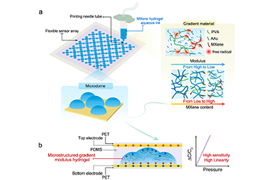 为应对这一挑战,四川大学材料科学与工程学院张传芳教授团队提出了一种全新的设计策略:通过MXene触发化学实现梯度模量水凝胶的快速可打印化,并结合3D打印技术精确构建多尺度微穹顶结构。该策略实现了材料模量与几何结构的协同调控,从根本上缓解了灵敏度与线性度之间的固有矛盾。