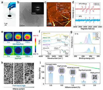 为揭示 MXene 在凝胶化过程中的化学作用机制,研究对 MXene-PAA/PVA体系进行了系统表征。MXene 纳米片具有优异的层状结构与胶体稳定性(图2a-c),并能促进自由基生成,从而显著加速聚合反应速率。电子自旋共振结果证实,MXene 触发的自由基浓度远高于纯水凝胶体系(图2d),同时热成像监测到聚合反应放热明显提前(图2e)。