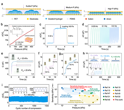 在器件性能测试中,梯度模量微结构传感器表现出优异的综合特性(图4a-j)。