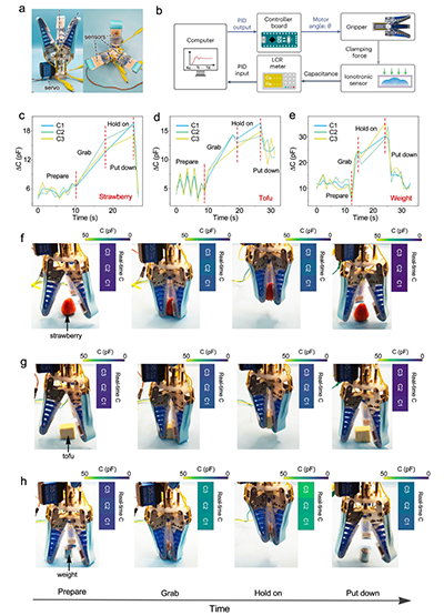 将该传感阵列集成至柔性机械手的三指端部后,团队展示了机器人对草莓、豆腐、金属块等不同材料与形状目标的实时抓取感知。传感器输出信号能精确反映接触力分布与物体刚度变化,实现无损抓取与自适应控制。这种高精度压力反馈系统展现了MXene-3D打印柔性传感器在智能机器人、人机交互及电子皮肤领域的巨大应用潜力。