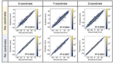 图2. 绝对坐标模型与相对坐标模型在x、y、z 三个坐标的前向预测与有限元基准结果对比R2分布