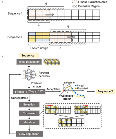 图4. 基于ML-SGA 的逆向设计流程示意图:a)条带沿长度方向采用滑动窗口进行局部优化,b)每段优化窗口内通过前向模型评估材料分布所得形状与目标形状的匹配度,并经过遗传算法实现迭代优化。