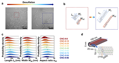 天然纤维素(I型纤维素)作为自然界中储量最丰富的生物高分子、其纳米晶体(CNC-I)因具备优异的光电磁与力学性能以及可再生可生物降解等优异特性已成为可持续纳米技术的重要构建基元。然而,CNC-I 的纳米手性以及其介观手性不可调,严重制约了新型纤维素光子材料的发展。针对这一现状,研究团队通过丝光化和硫酸水解将CNC-I转晶为II型纤维素纳米晶(CNC-II)。获得的纳米晶手性微弱且长径比低,几乎不具备手性组装能力。通过对粒子进行脱硫处理,诱导纳米晶沿疏水晶面聚集,从而实现了对液晶基元长径比和扭转手性的裁剪和放大。