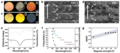 图4:右旋手性光子CNC-II薄膜及其介观结构的调控。 (a-d) 照片和相应的横截面SEM图像显示了手性向列型结构的典型周期性层状结构(a上, b),以及CNC-I左旋光子薄膜的相应表征(c, d)。 (e) 相应CNC-II薄膜的圆二色光谱(实线)和透过光谱(虚线)显示了右旋手性向列型结构的形成。(f, g) CNC-II薄膜的反射峰波长从可见光到近红外波段宽泛可调(f)和反射光的圆偏振度的外磁场强度依赖(g)。注:(f) 误差棒表示30次测量的标准偏差。(g) DOCP值随磁场强度变化的趋势,其中红色虚线表示线性相关,灰色阴影区域表示拟合的不确定性。