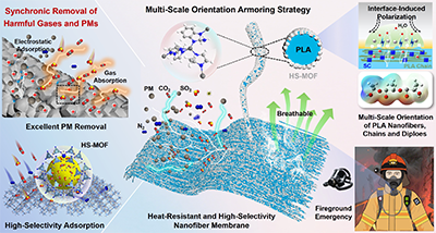 摘要图:聚乳酸活性纳纤膜实现耐高温以及颗粒物与毒害气体一体化共防