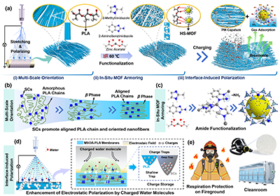 研究团队提出了一种面向火场等极端环境的多尺度取向铠甲化策略,通过立构复合晶诱导取向、界面极化增强电荷存储及多孔晶体铠甲化协同净化,构建兼具结构稳定性与电学活性的纳米纤维防护膜。该策略在高压电场与高速牵伸协同作用下,实现聚乳酸纳米纤维在分子链、偶极子及纤维尺度上的多级取向重构,显著提升材料的耐高温性能。进一步引入氨基修饰MOF晶体铠甲化与界面诱导极化效应,使单一膜材料协同实现有毒气体选择性吸附与颗粒物高效过滤。