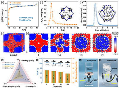 在微观结构性能调控基础上,研究进一步完成了膜在孔结构、表面化学与宏观性能上的系统优化。通过高密度微孔与超微孔的协同构筑,形成丰富的吸附位点,为有毒气体的高效捕获提供分子级保障。高选择性MOF晶体在纤维表面的均匀负载略微降低了孔隙率的同时增强了表面活性,使水分子易于滞留于纤维界面,从而提升对极性污染物的吸附效率。经多尺度铠甲化构筑的纳米纤维膜在保持优异空气通透性的同时,展现出优异力学强度,为高温、高尘毒等复杂环境下的长期高效防护奠定坚实基础。