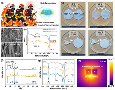 多尺度取向铠甲化策略显著增强了膜在高温条件下的结构稳定性与热力学性能。在120?°C下长时间暴露仍能保持纤维平整无明显收缩变形,优异耐热性主要归功于MOF晶体支撑作用与物理交联效应,有效限制聚乳酸链段运动,抑制纤维热变形。膜的结晶度与界面相互作用增强,进一步提高热稳定性,并赋予优异热舒适性,在模拟光照下表面温度低于未铠甲化膜。刚性骨架与界面增强效应,使膜在高温环境下长期维持稳定防护性能,为极端工况下呼吸防护提供可靠保障。