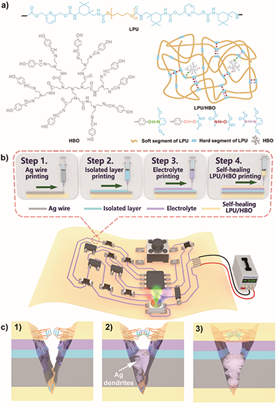 1. (a) 自修复LPU/HBO及其分子间氢键相互作用示意图。(b) 自修复PCBs的制备过程。(c) 金属线路和聚合物基底/封装层的修复机制示意图。