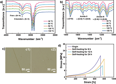 2. (a, b) LPU/HBO的变温FTIR光谱。(c) LPU/HBO修复前后的光学图像。(d) 原始和室温修复不同时间的LPU/HBO的典型应力-应变曲线。